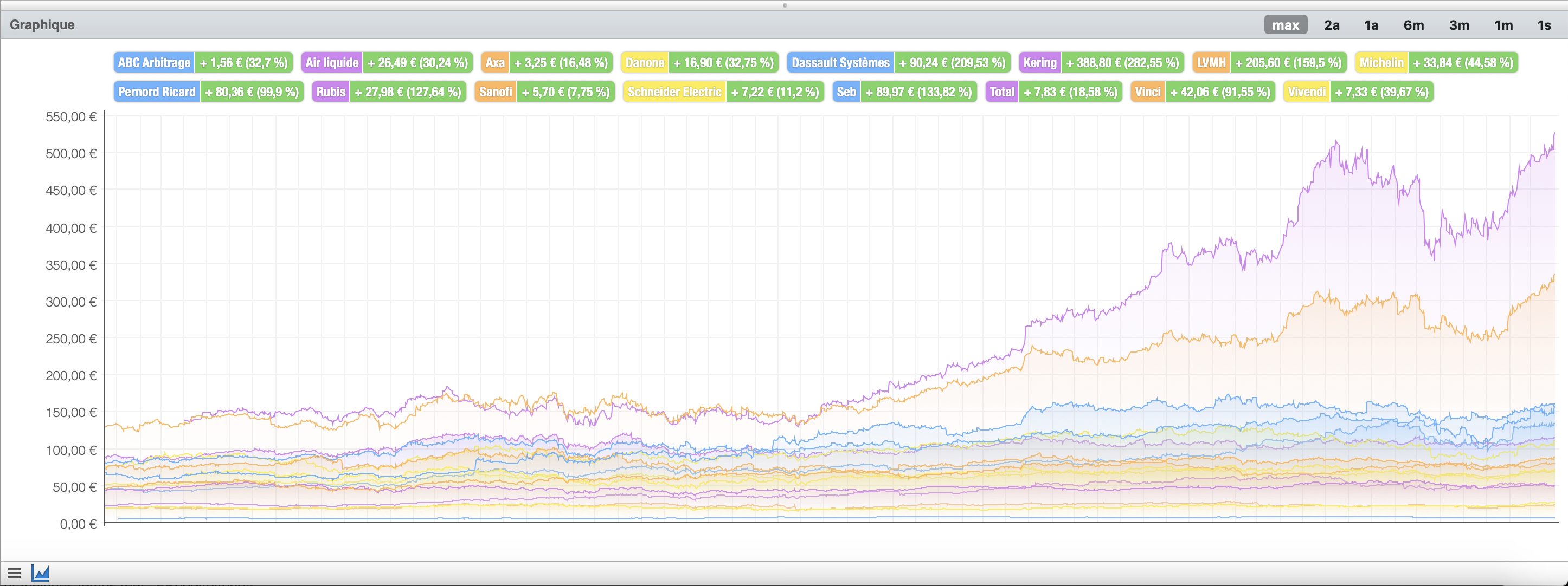 Quand je désire afficher plusieurs titres de bourses (Données sur 5 ans) iCompta est lent est fait même tourner les ventillateurs de mon MacBook Pro, modèle 15 pouces 2018. J'ai importé les données en CSV sur 5 ans via Yahoo.